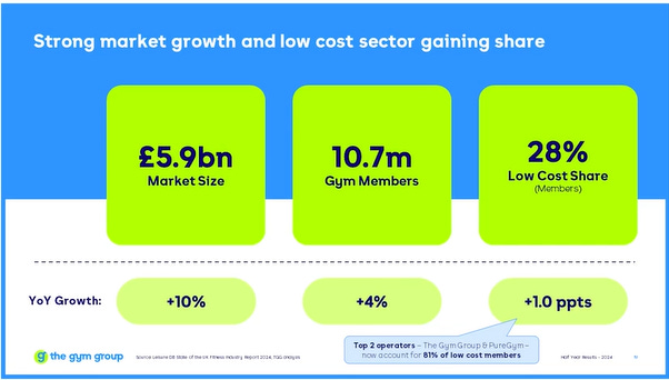 So why would this be the growth area to invest in? Well today, gyms are becoming the new pub or club apparently. The youth of today are very fitness-aware, many go to the gym in groups together, or as couples and work out and socialise, compared to my youth when Friday night was 6 pints of Guiness and a Doner Kebab, today young adults prefer to be as peak fit and often as alcohol-free as they can - they will never have a physique like mine doing that :-) . The demographics and trends are strongly improving for low cost gyms. The Gym Group is cheaper headline priced than their competitors but have been narrowing that gap while competitors raise their prices and there is headroom for higher prices.